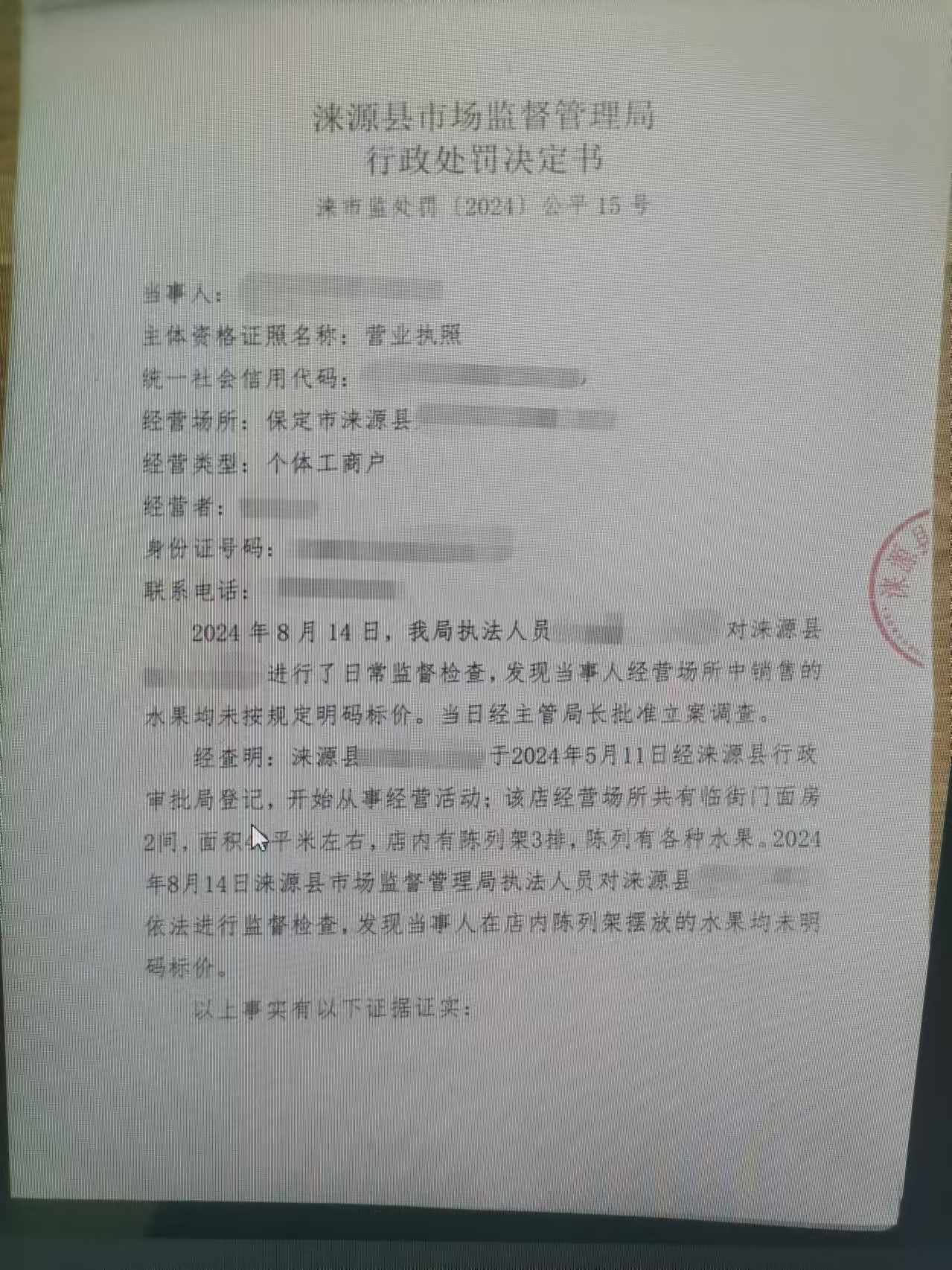 涞市监处罚〔2024〕公平15号,涞源县牧用水果店未按规定明码标价案