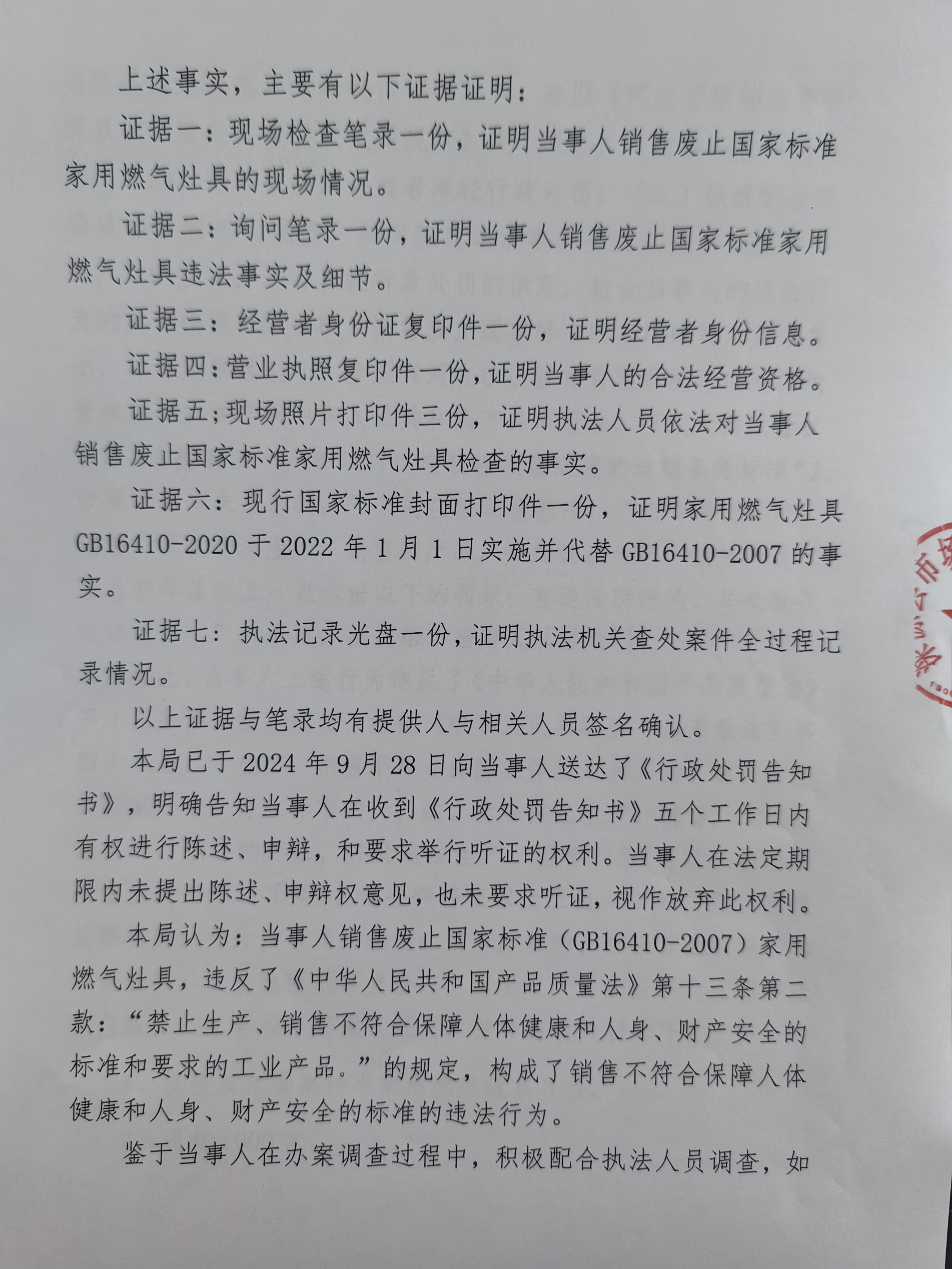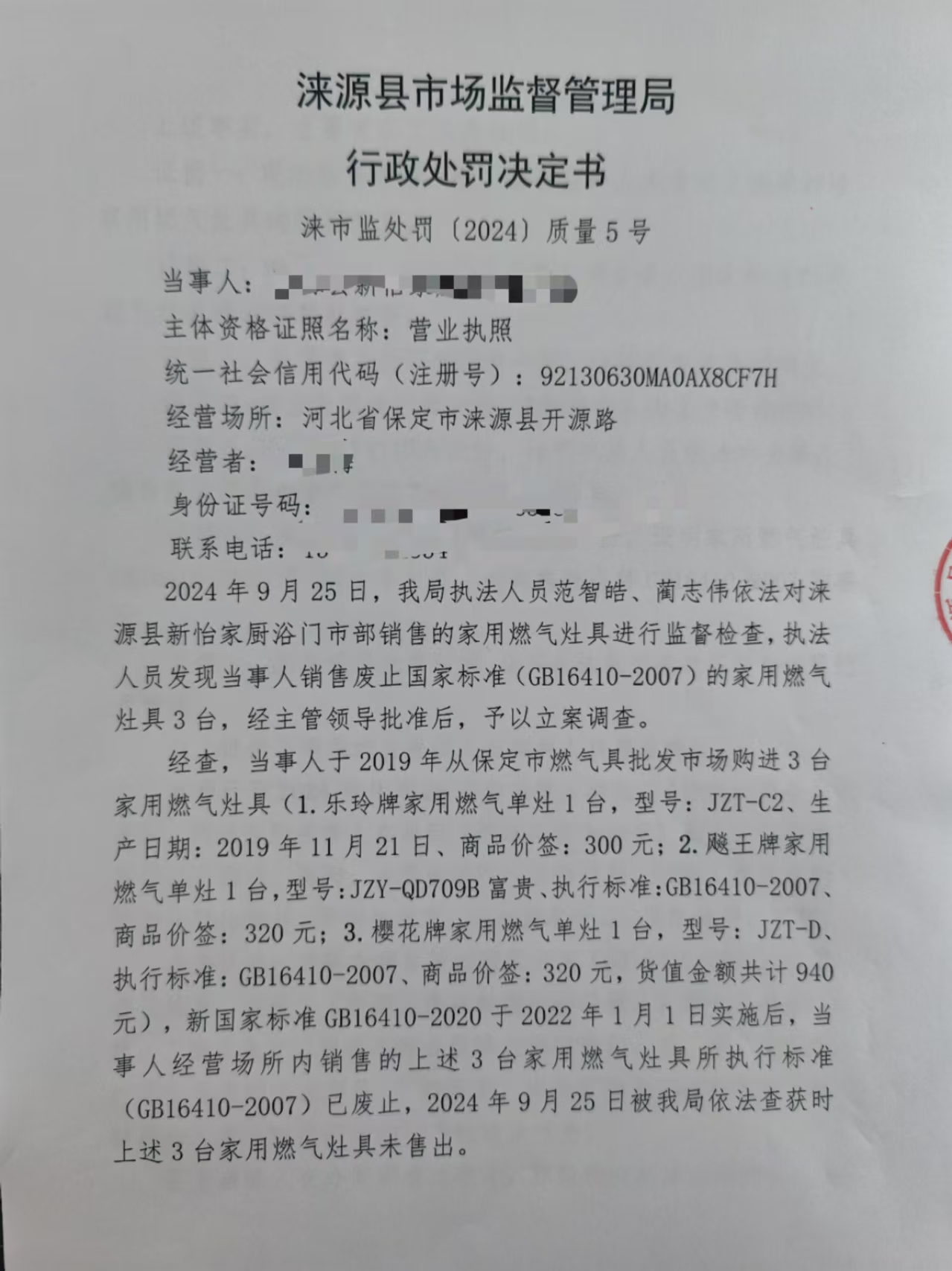 涞市监处罚〔2024〕质量5号涞源县新怡家厨浴门市部销售废止国家标准家用燃气灶具案