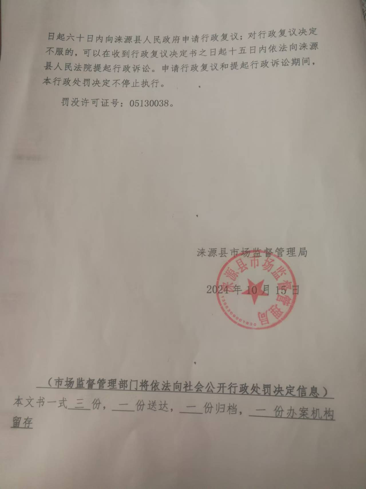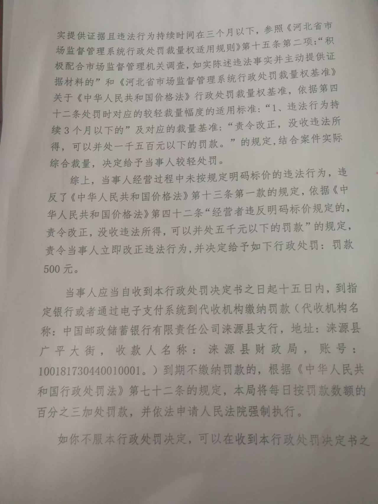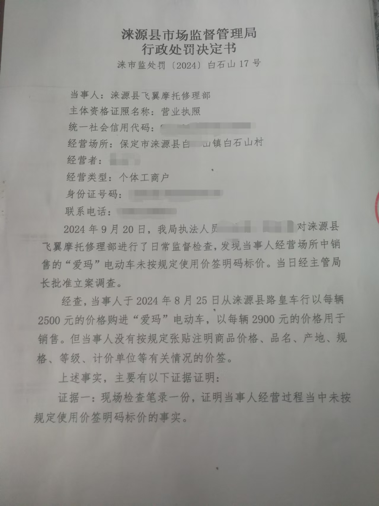 涞市监〔2024〕白石山17号涞源县飞翼摩托修理部未按规定明码标价