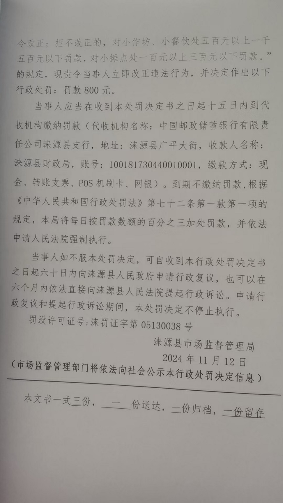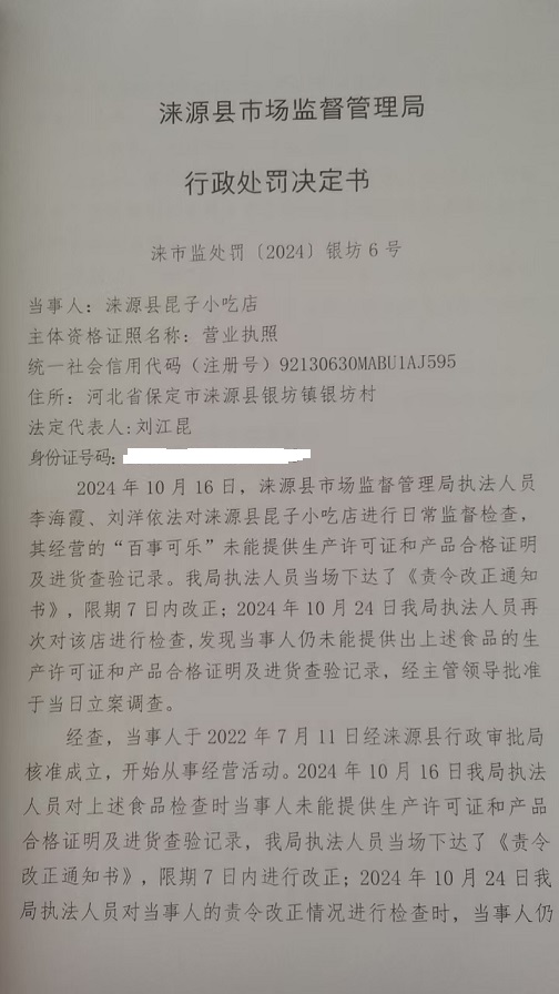 涞市监处罚〔2024〕银坊6号涞源县昆子小吃店未按规定建立进货查验记录制度案
