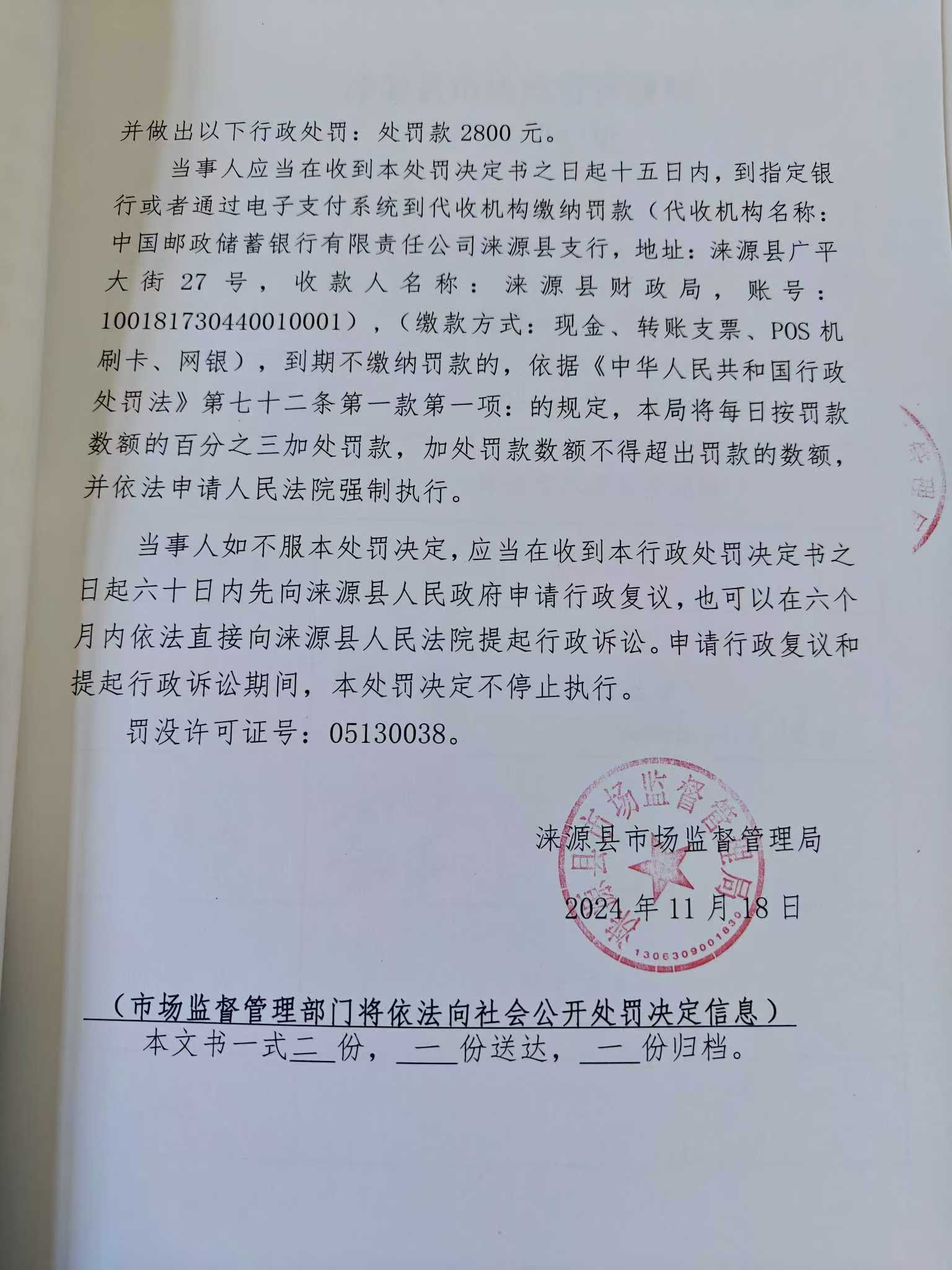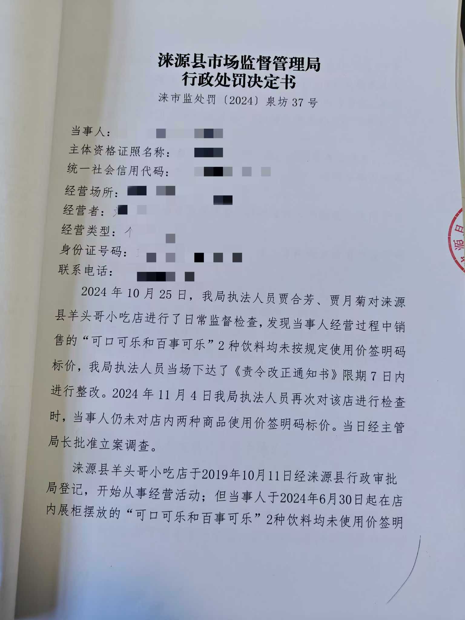 涞市监处罚〔2024〕泉坊37号涞源县羊头哥小吃店未按规定明码标价案