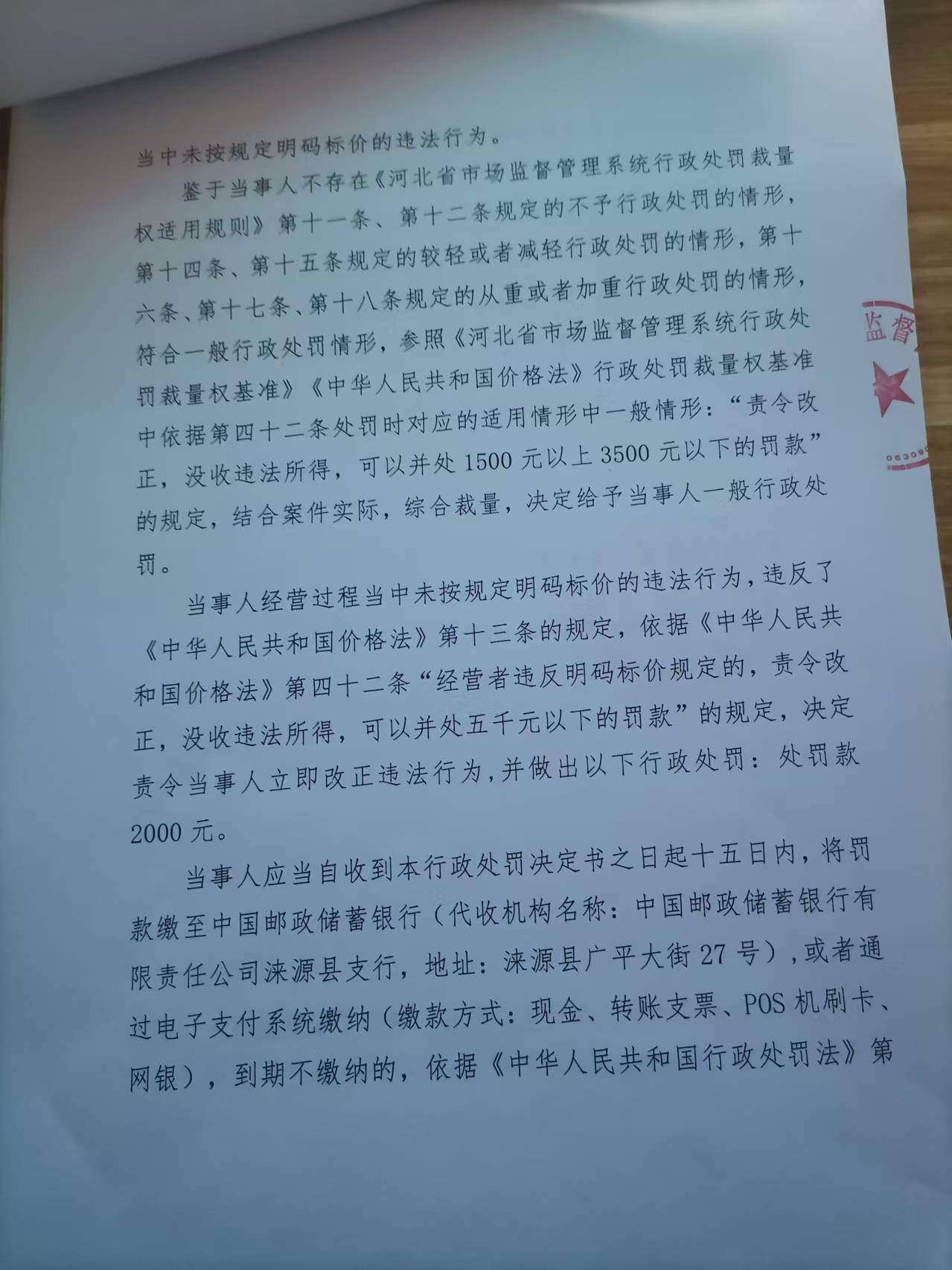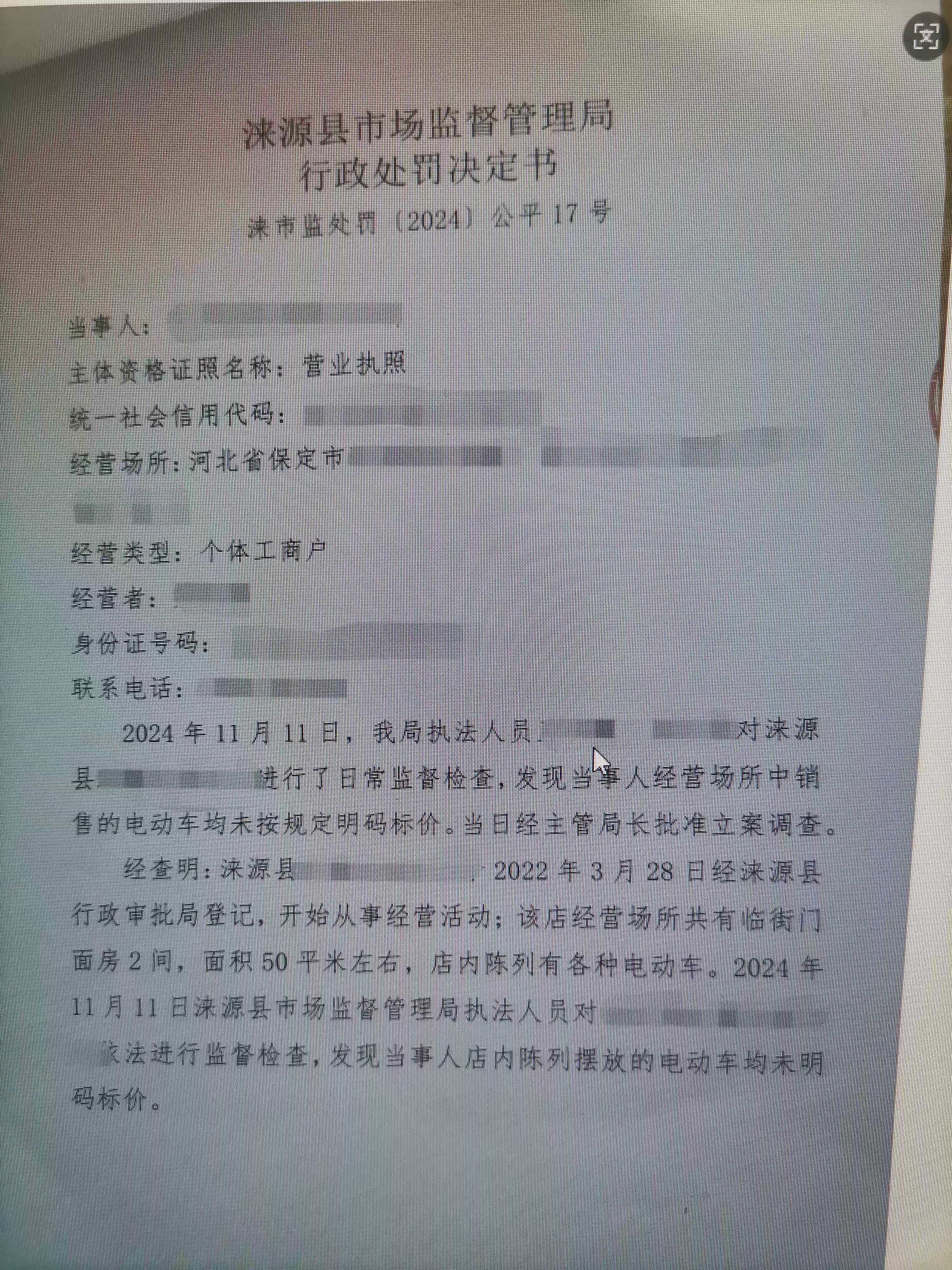 涞市监处罚〔2024〕公平17号,涞源县新蕾电动车行未按规定明码标价案