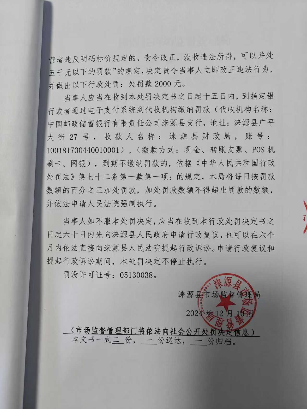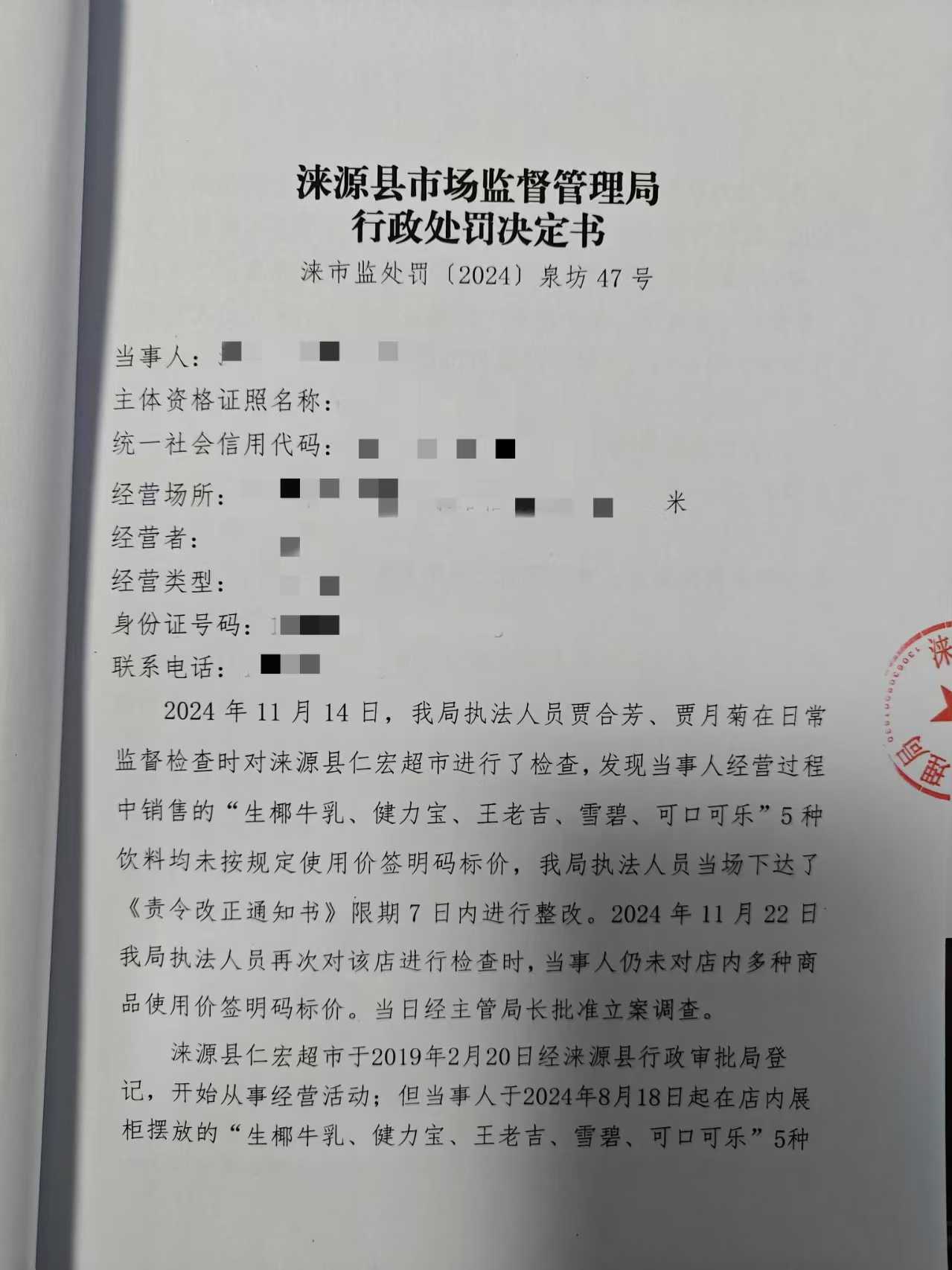 涞市监处罚〔2024〕泉坊47号涞源县仁宏超市未按规定明码标价案