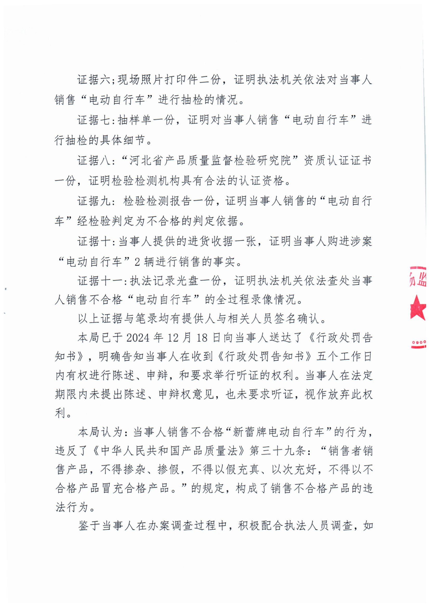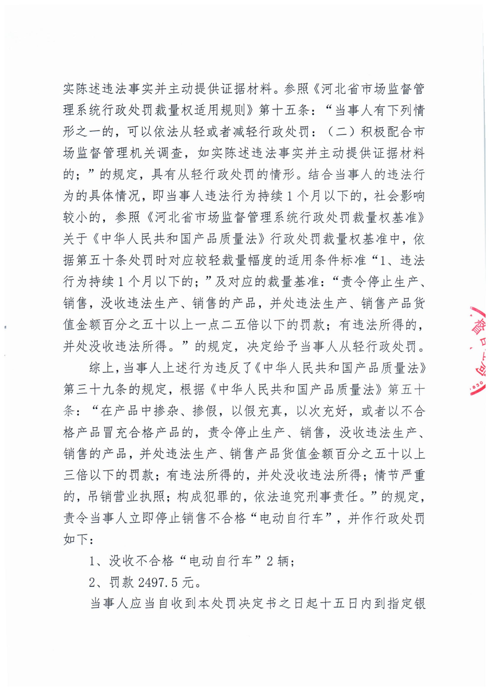 涞市监处罚(2024)质量8号 涞源县新蕾电动车行销售不合格“电动自行车”案