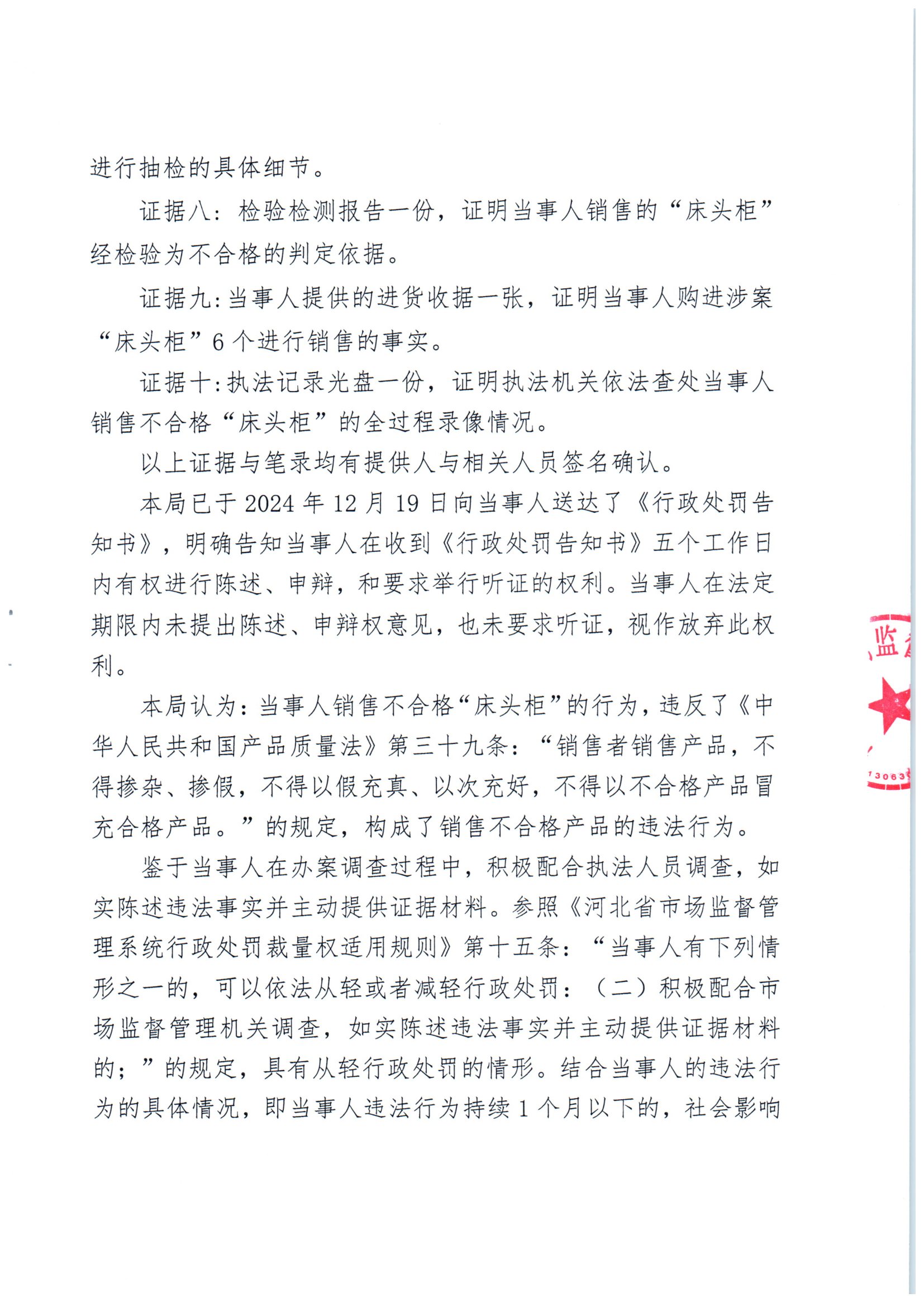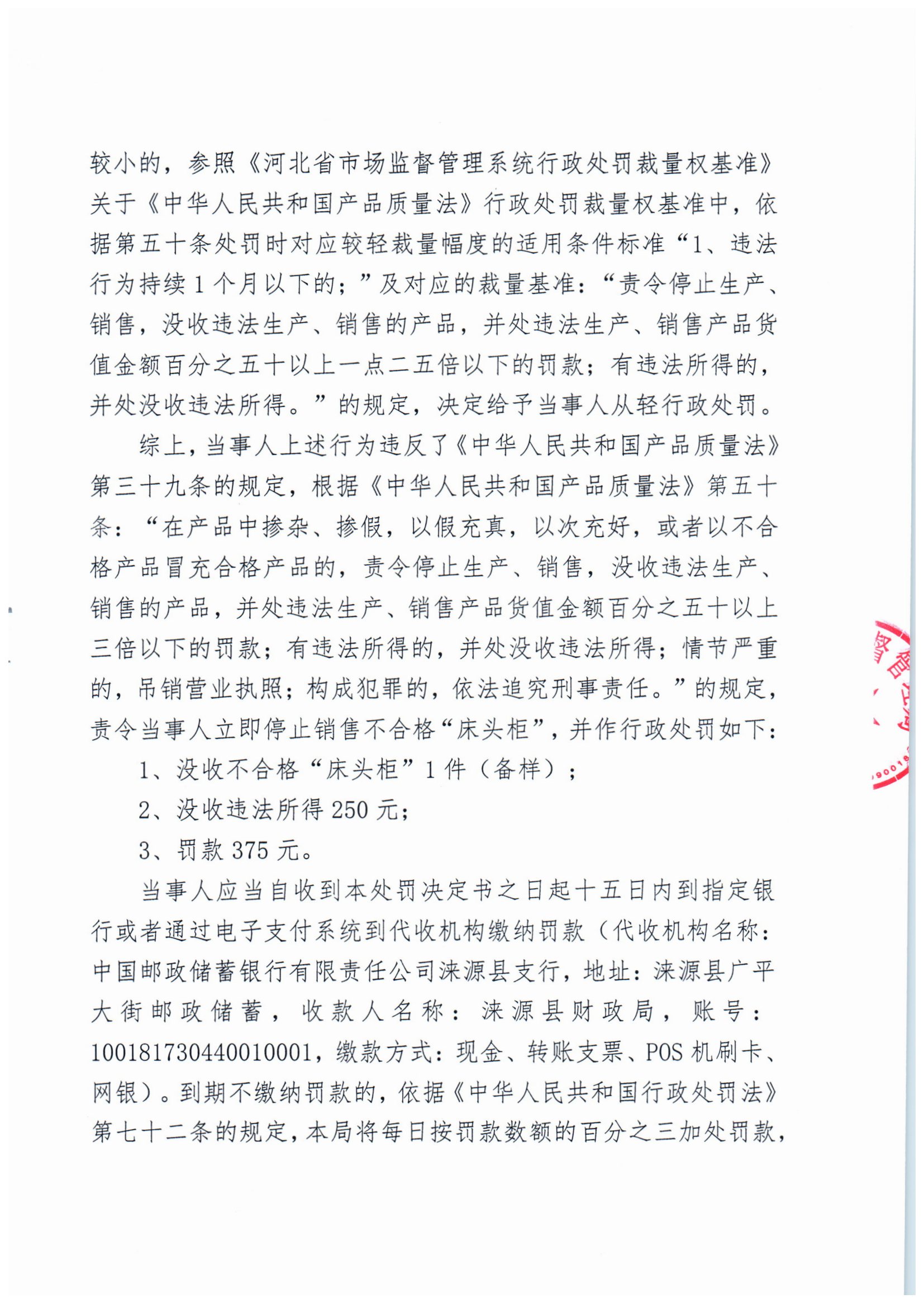涞市监处罚(2024)质量11号 涞源县欣怡家具五金装饰店销售不合格“床头柜”案