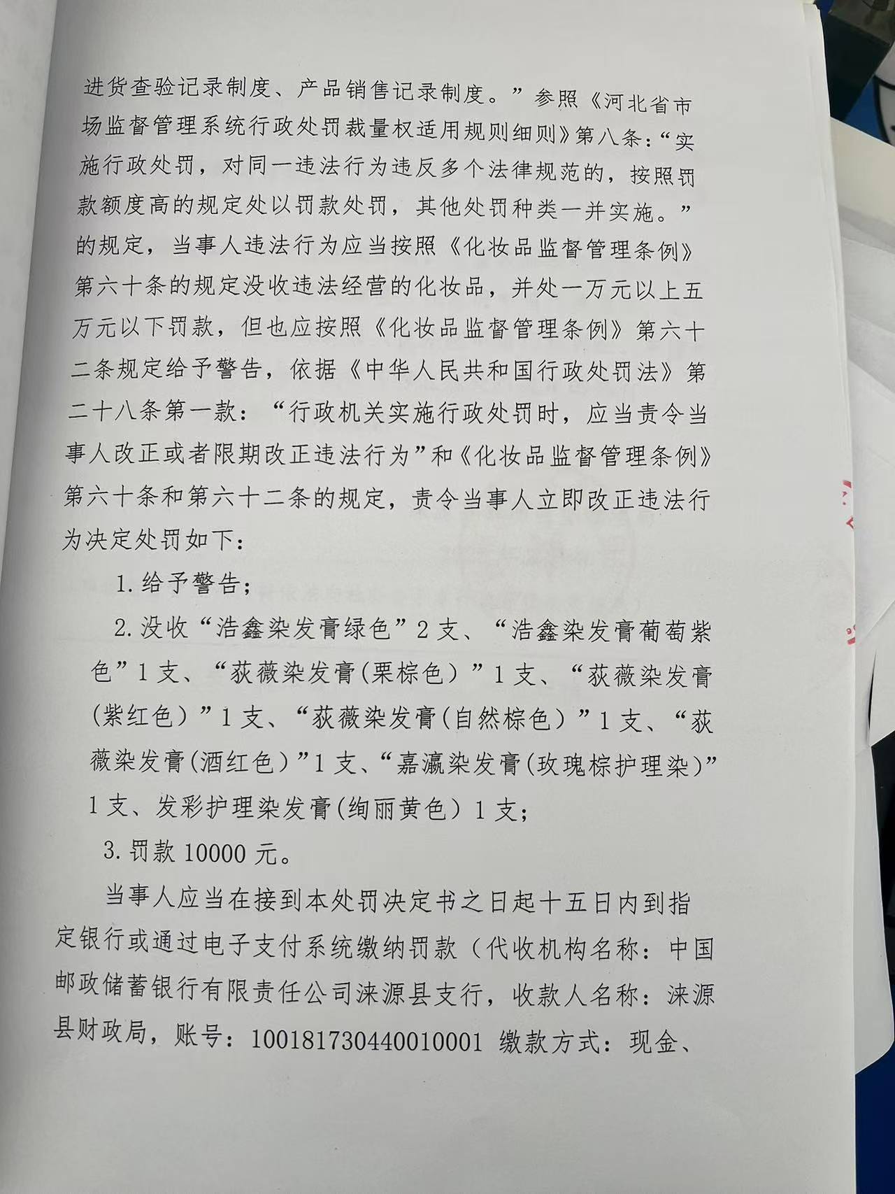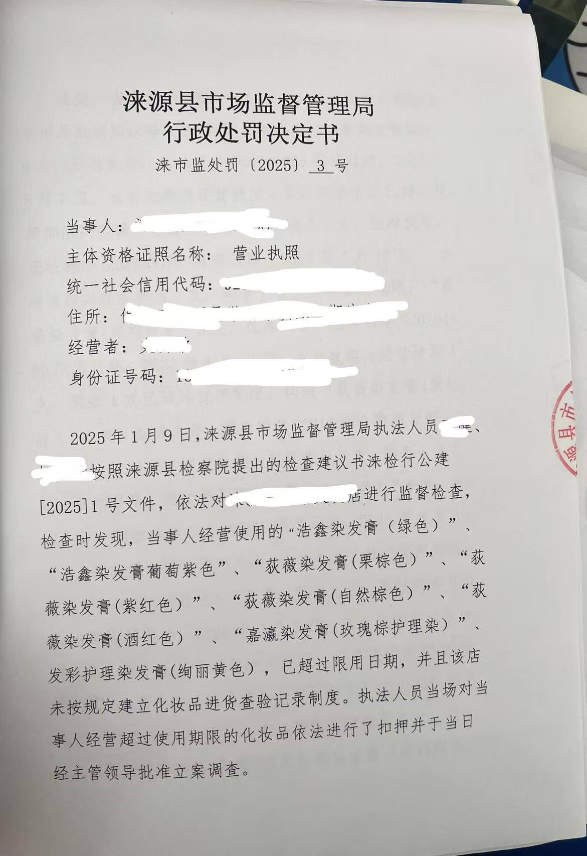 涞市监处罚【2025】3号涞源县公子美发店经营超过使用期限化妆品案