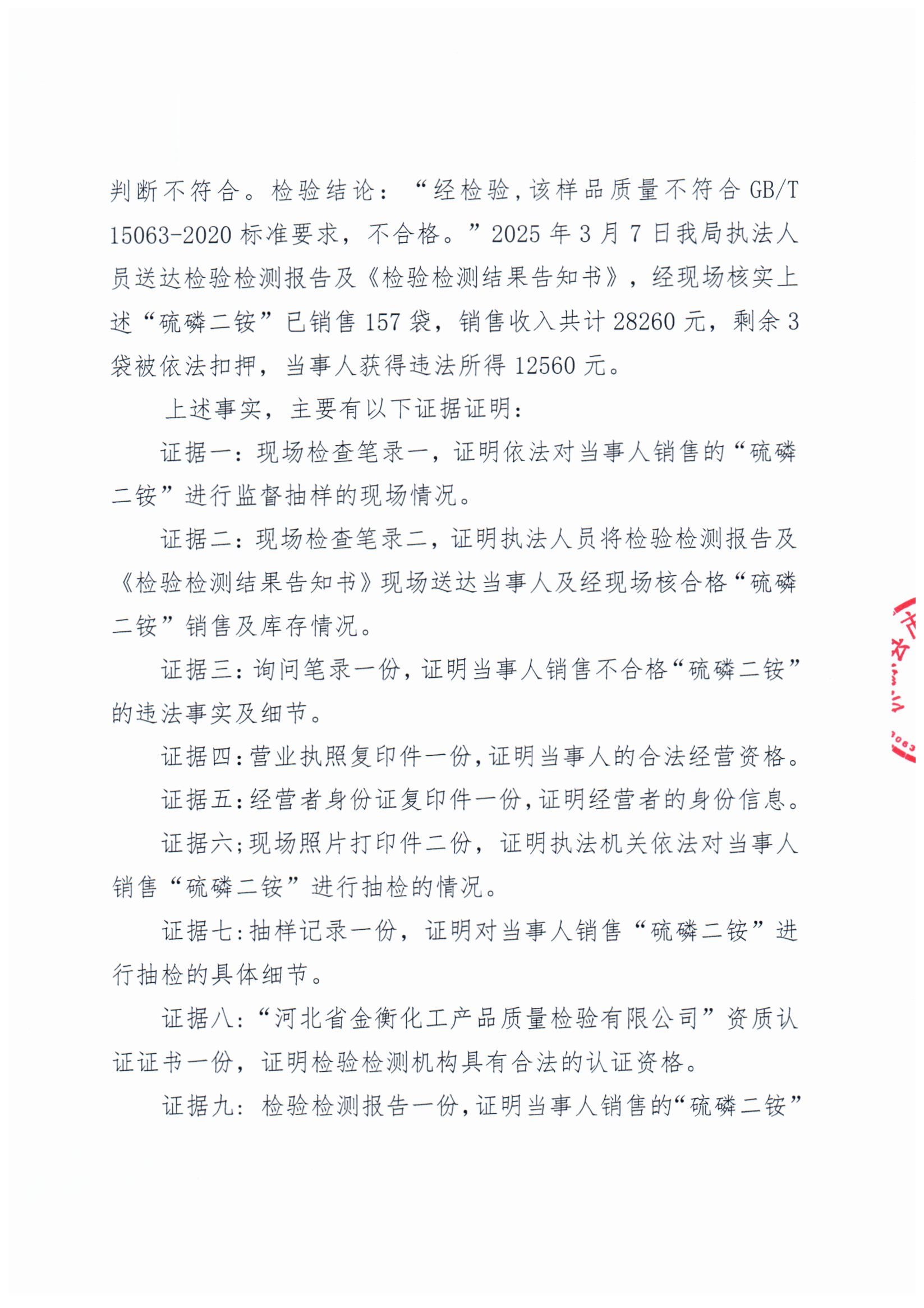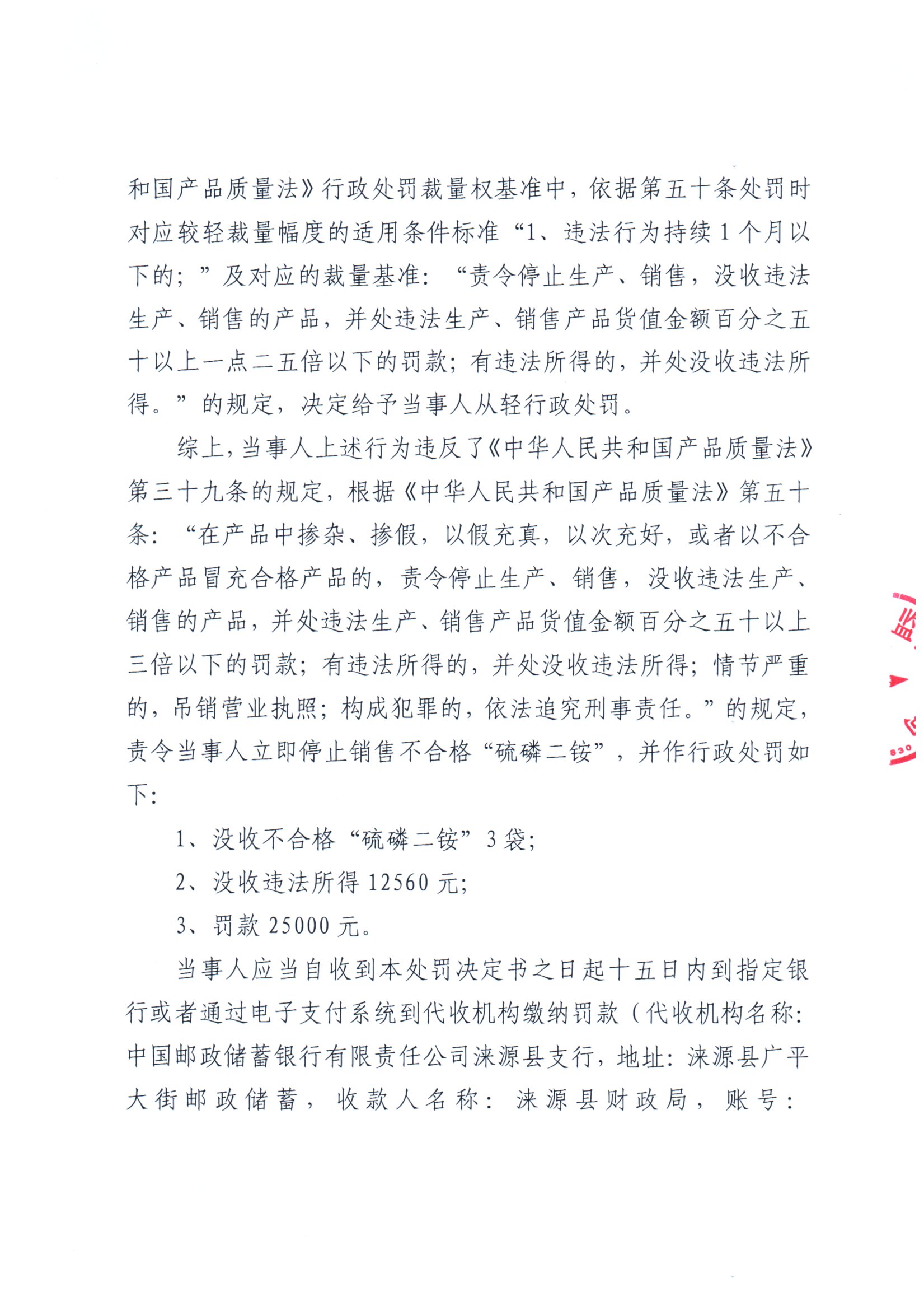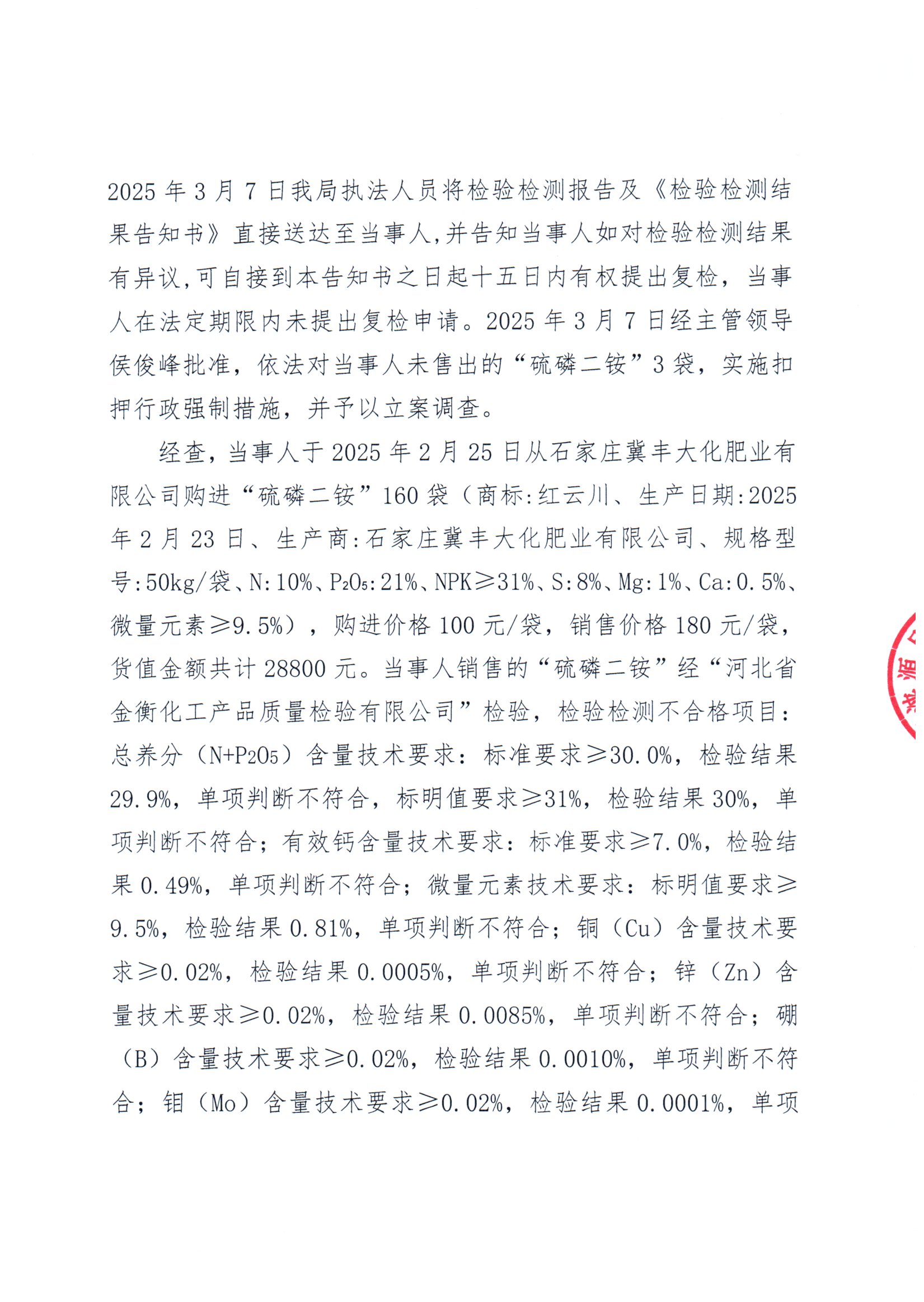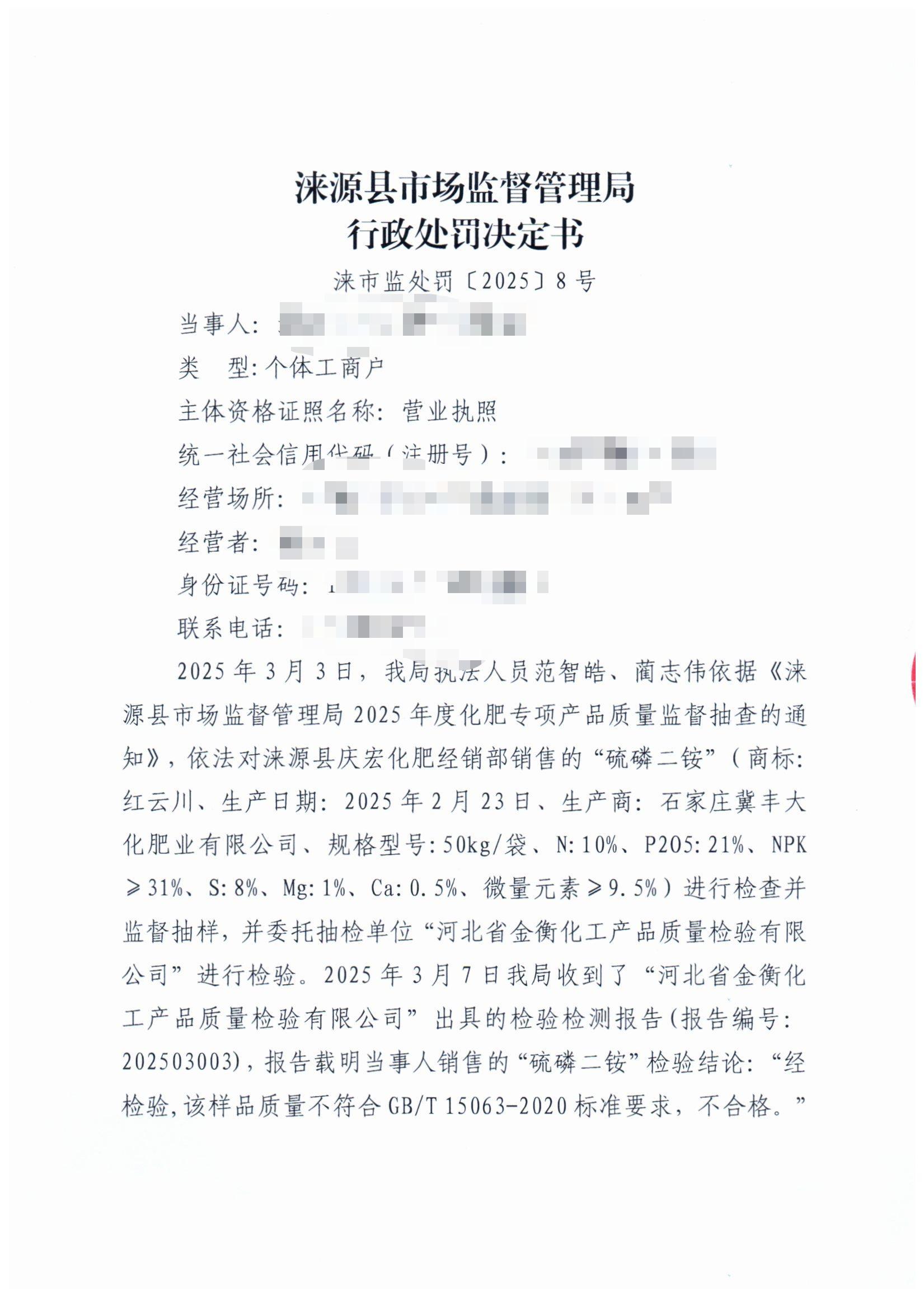 涞市监处罚〔2025〕8号 涞源县庆宏化肥经销部销售不合格“硫磷二铵”案