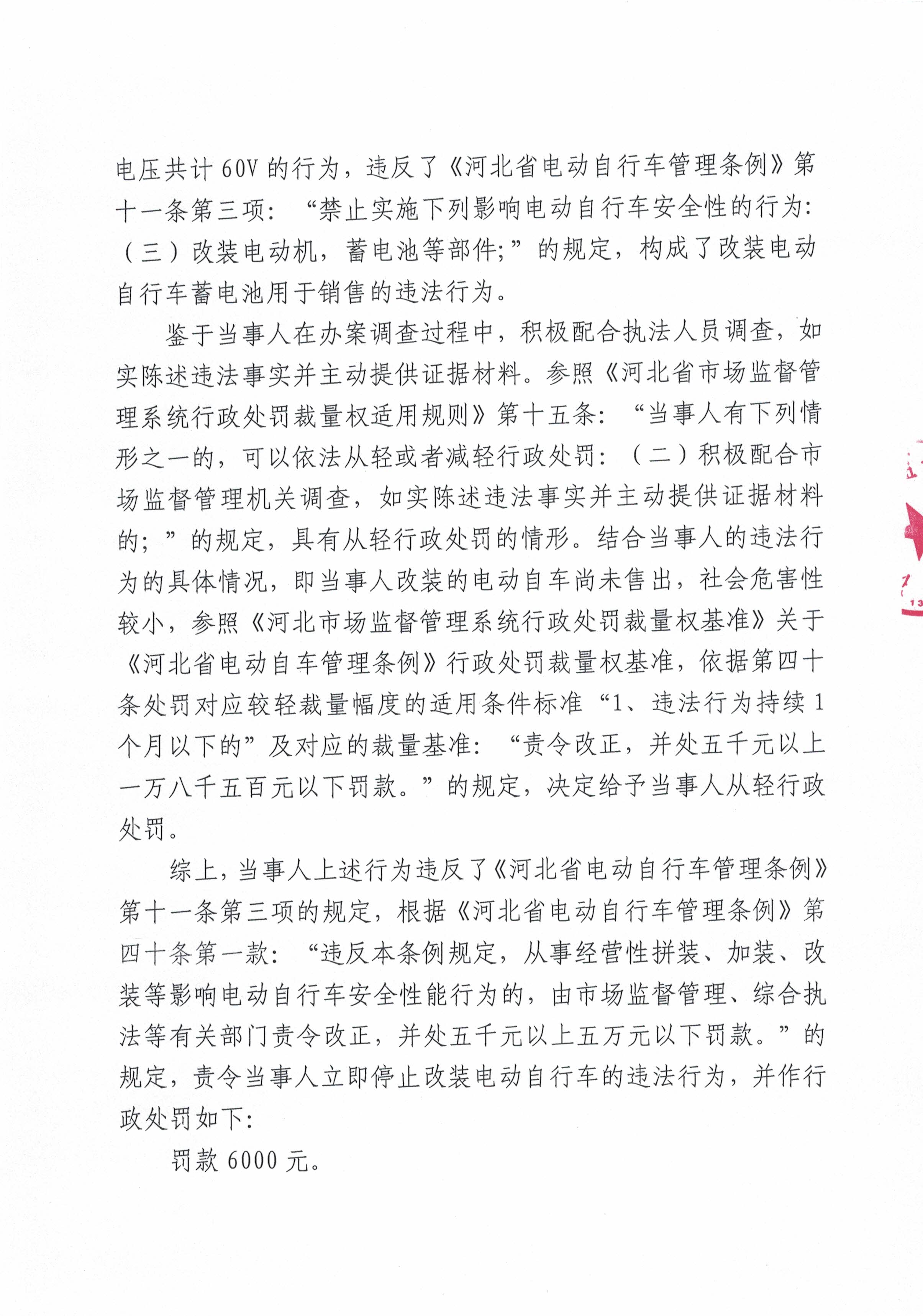 涞市监处罚〔2025〕18号 涞源县路皇车行改装电动自行车蓄电池用于销售案
