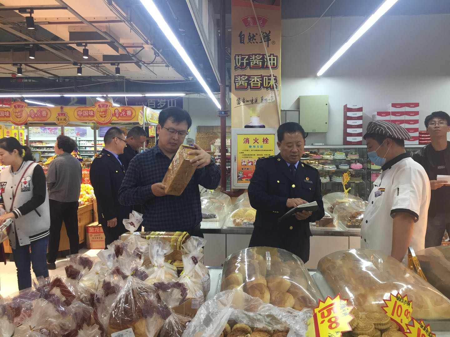 中秋国庆将至,食品、保健食品消费量增加,为保障全县人民饮食安全和身体健康,9月20日上午,县政府副县长、食安委副主任汪源带队,县市场监管局牵头,联合农业、畜牧、公安等部门,对节日市场食品生产经营单位进行了联合执法检查。 ![]() 汪源副县长检查超市面包标签 检查组先后对信誉恒隆超市、第一时间面包房、易龙药店、沙河上牌楼菜市场及汽车站、火车站周边食品经营单位进行了检查。以月饼、酒类、乳制品、肉制品、饮料等节日旺销食品为重点品种,以索证索票、进货查验及台账建立、食品添加剂使用、服务人员健康证明、环境卫生等为重点内容进行了全面检查。